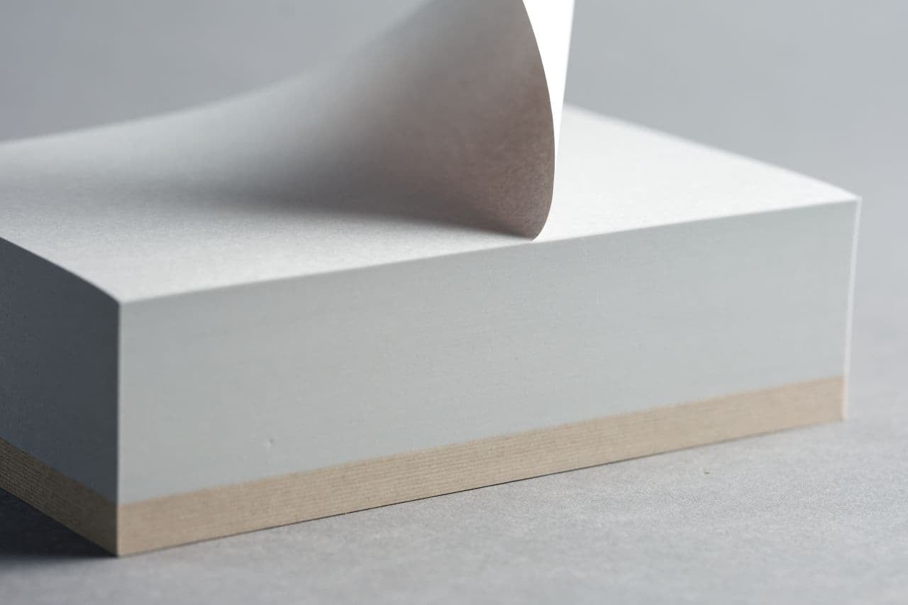 ダンボール古紙を原料とする厚みのある台紙が特徴です。材料の選定から最終工程まで、1つずつ丁寧に仕上げました。スッキリとしたシンプルなデザイン。ストレスなくキレイに切り離すことができます。側面から見る本文と台紙のコントラストは美しく、いかなる場所でも調和します。固い印象と異なり書き心地はとても滑らかです。